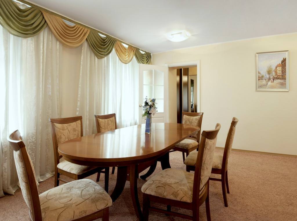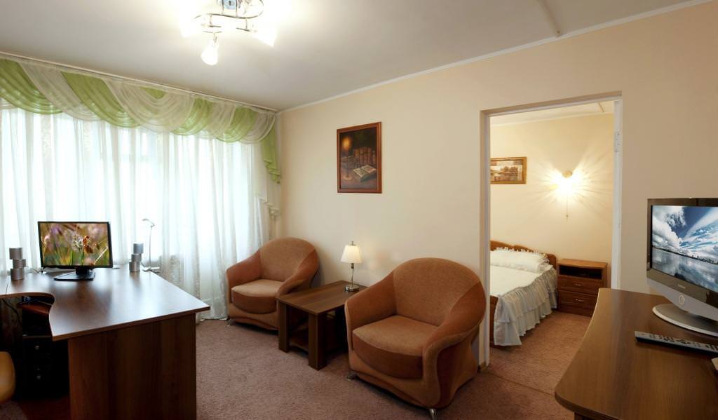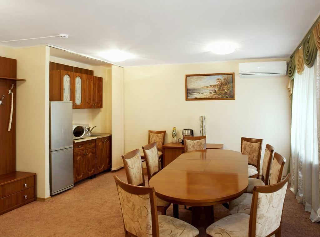 Площадь номера - 52 кв.м. 2 осн. места. 1 доп. место. Балкон. Мебель: вешалка, зеркало, кровать двуспальная, кухонная мебель, набор мягкой мебели, прикроватные тумбочки, стол, стол для компьютера, столик журнальный, столик туалетный, стулья, шкаф. Мини-кухня. Оборудование: гладильная доска, компьютер, кондиционер, кофемашина, микроволновая печь, набор посуды, телевизор, телефон, утюг, холодильник, чайный набор посуды, электрочайник. Санузел: с душевой кабиной, тапочки, туалетные принадлежности, фен. Сервис: смена полотенец, смена постельного белья, уборка номера.
