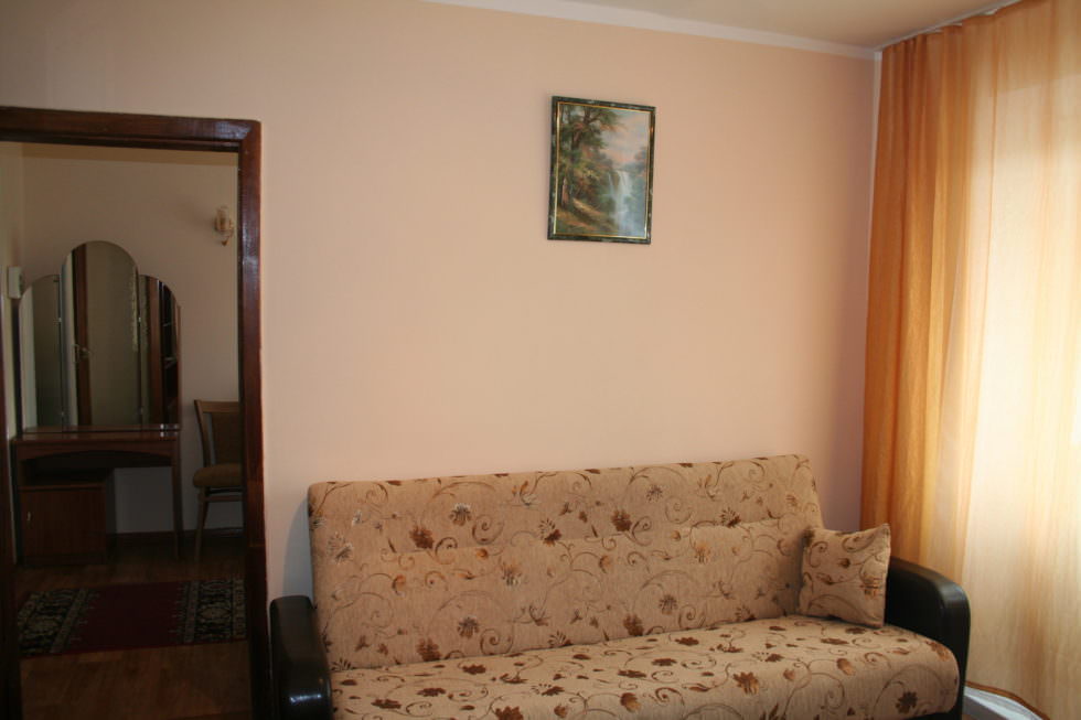 Площадь номера - 30 кв.м. 2 осн. места. 2 доп. места. Балкон. Мебель: вешалка, диван, зеркало, кровати односпальные, прикроватные тумбочки, столик журнальный, стулья, шкаф. Оборудование: телевизор, холодильник. Санузел. Сервис: смена полотенец, смена постельного белья, уборка номера.